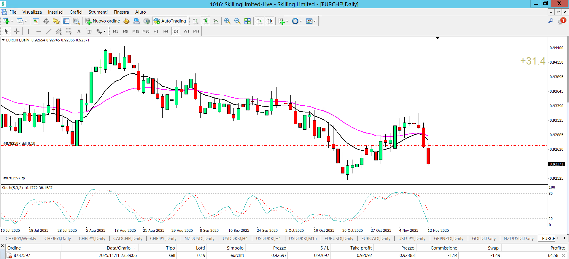 Situazione alle 15.25 del segnale DI INVERSIONE SELL SU EURCHF DI IERI SERA