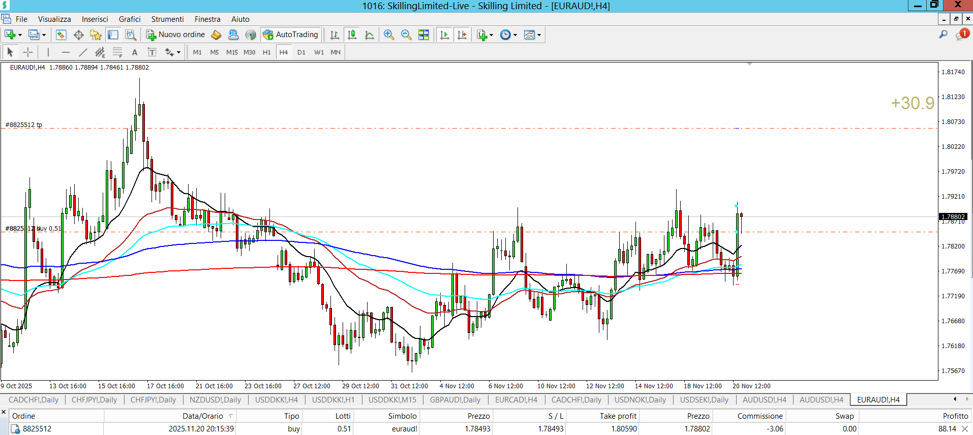 Situazione alle 19.39 del segnale H4 BUY E BUY LIMIT SU EURAUD DELLE 19