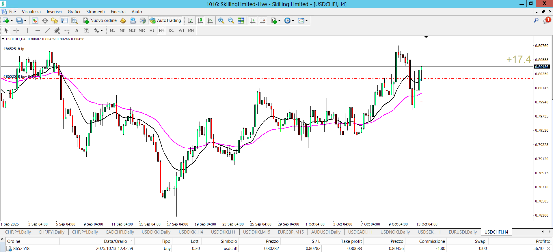 Situazione alle 14.35 del segnale H4 RUBINO BUY LIMIT SU USDCHF DELLE 11