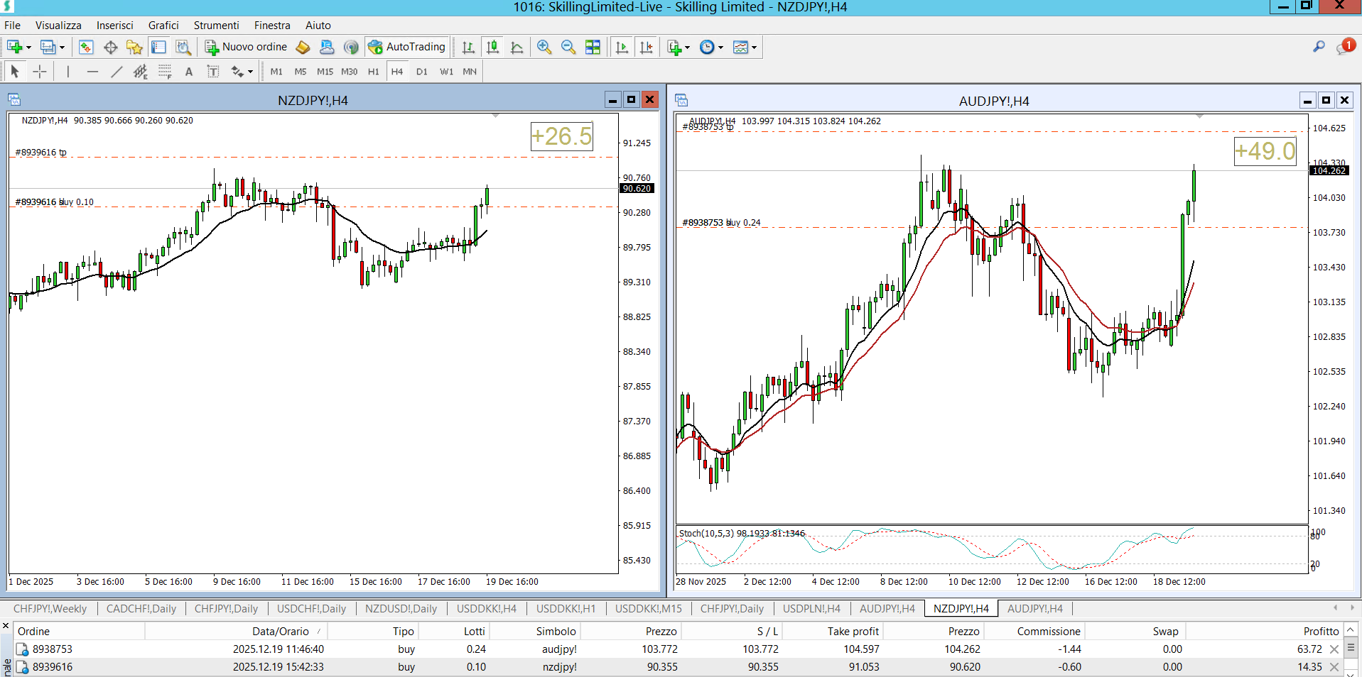 Situazione alle 16.20 dei 2 segnali H4 BUY su AUDJPY e NZDJPY delle ore 11
